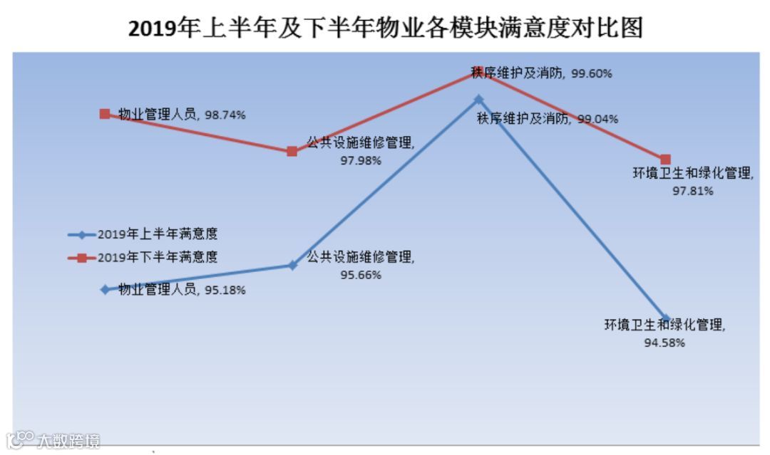 对比上半年物业满意度数据,四大模块满意度有所提高,客户对综合项目管理各模块满意度总体评价呈上升趋势: