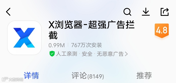 据企盾宝调查显示,这款被告的App名为“X浏览器”,跟其他的移动端浏览器不一样的地方是这个浏览器自带了“超级广告拦截”的功能。该功能是这个“X浏览器”APP的主要宣传点。