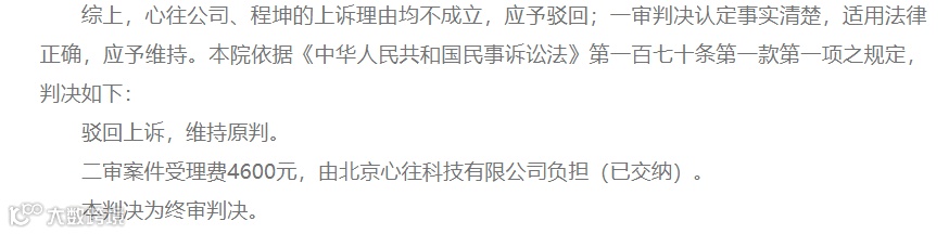 最后,经过法院审理:判决被告北京心往科技有限公司、被告程坤立即停止涉案不正当竞争行为,并共同赔偿原告优酷信息技术(北京)有限公司经济损失200000元及合理开支20000元。随后北京心往科技有限公司提起上诉,二审维持原判。