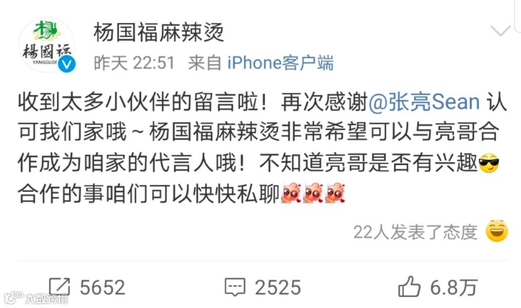 更精彩的是,杨国福麻辣烫官微竟然真的发微博邀请明星张亮做代言人,并且艾特了一下张亮本人。这波隔空邀约合作,可谓稳中带皮,皮中带秒啊,顺便也把这次事件的欢乐程度推向了高潮。