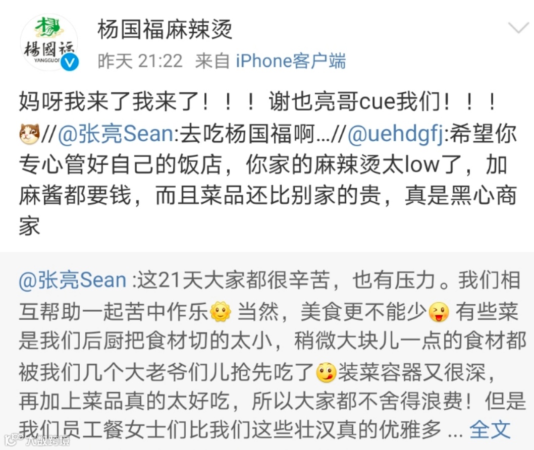 自从看到这条回复,“去吃杨国福啊…去吃杨国福啊…去吃杨国福啊…”这句魔性的话就一直在脑海中久久不能散去,该条回复点赞数也瞬间破10万。吃瓜群众的反应都是——张亮麻辣烫,原来真的不是明星张亮开的啊,终于破案了!