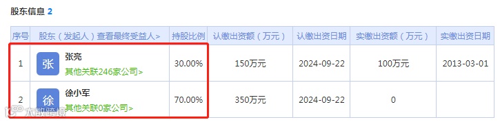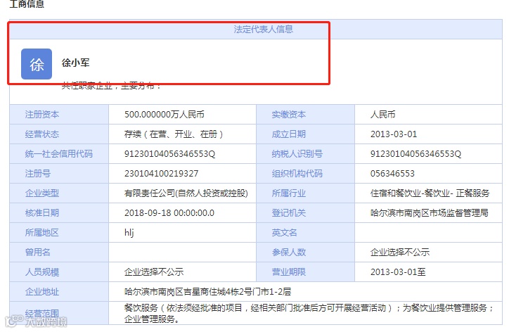 据企盾宝调查显示,张亮麻辣烫的运营主体是黑龙江省张亮餐饮有限公司,注册资本500万,法定代表人是徐小军,他也是公司大股东,占股70%,而张亮(非明星)占股30%。