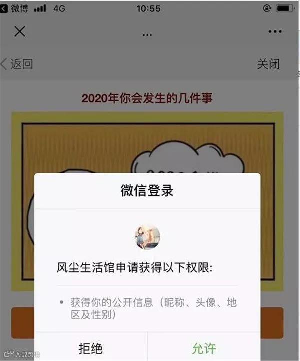 不过,不知道大家在玩这个游戏的时候,是否注意到了这样一个细节,那就是试玩前微信跳出来的一个提醒:风尘生活馆申请获得以下权限:获得你公开信息(昵称、头像、地区以及性别)。