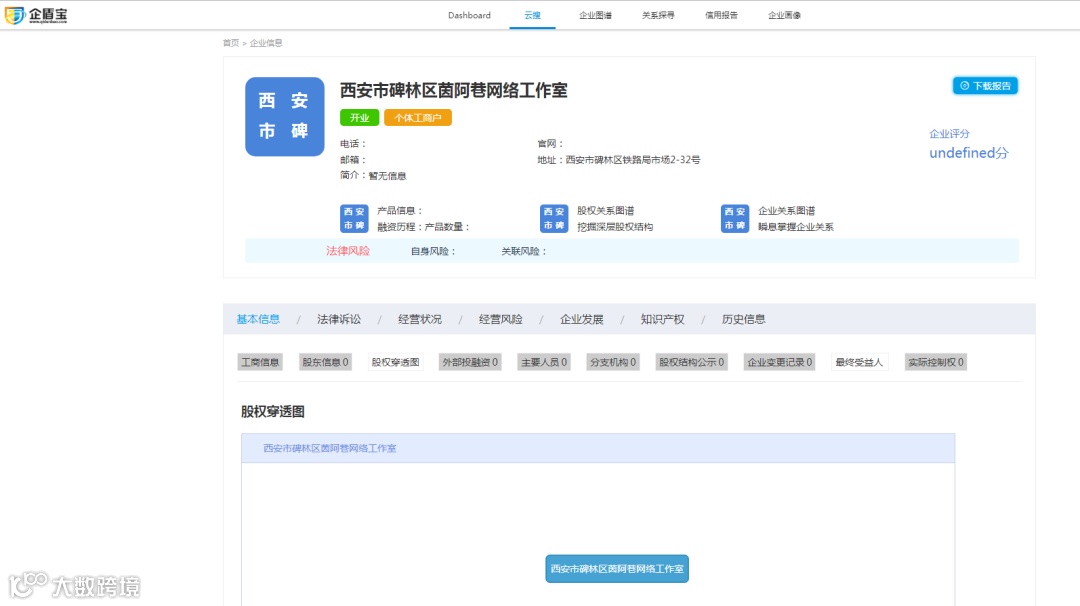 经查,“风尘生活馆”的真实身份是个微信公众号,公开资料显示账号的主体是西安市碑林区茵阿巷网络工作室,该公众号是在今年4月1日完成的微信认证。打开企盾宝查询可知,该企业的成立日期是2019年3月7日,除了工商信息,其他资料几乎是一片空白。与其说是在完善中(目前已经是12月了,这个完善期也太长了),不如说是皮包公司的标配。
