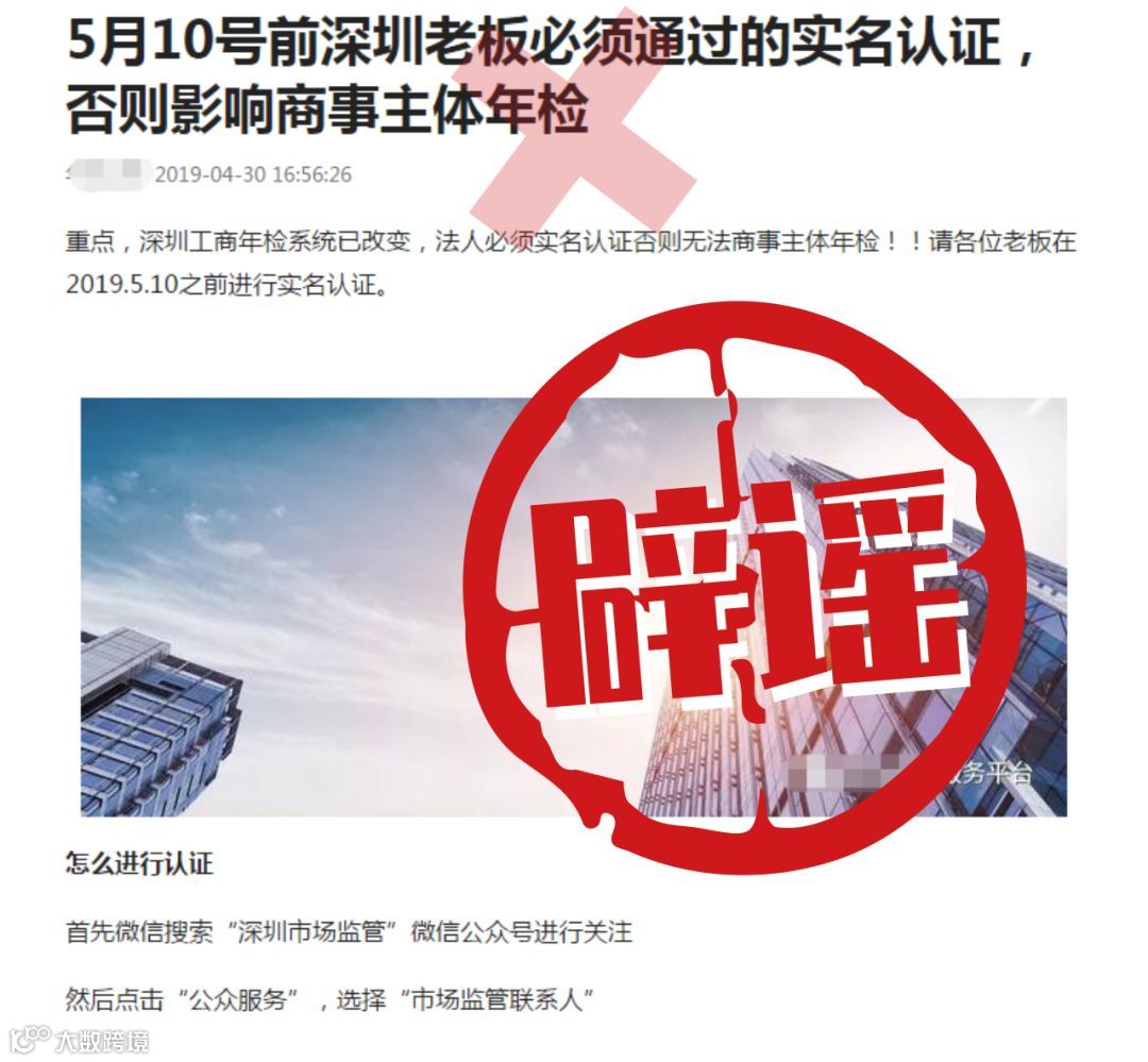 近日有媒体发布了“5月10号前深圳老板必须通过的实名认证,否则影响商事主体年检”的不实消息,请深圳的老板们不要相信,不要被误导!!