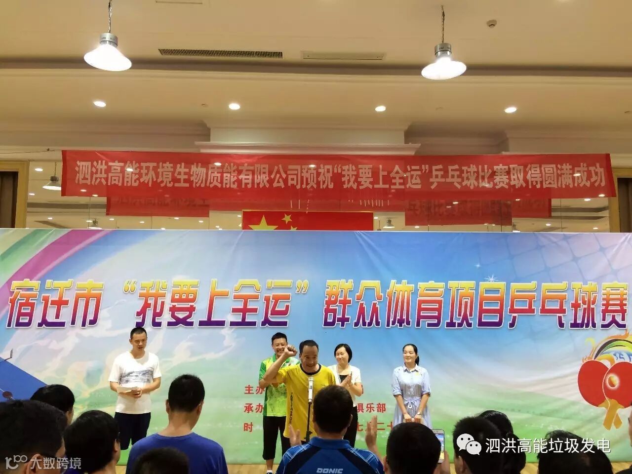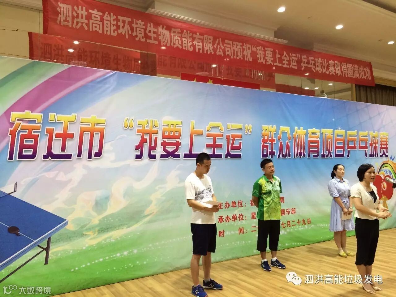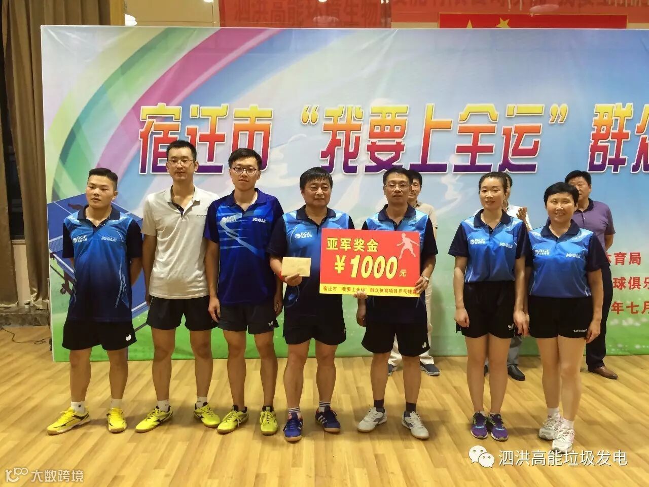 2017年7月29日由宿迁市体育局主办的宿迁市“我要上全运”群众体育项目乒乓球赛圆满落下了帷幕。应总公司宣传高能品牌的要求,泗洪高能子公司组队代表泗洪县参加了此次比赛。从开始策划到比赛结束,历时两周时间,经过全体人员的共同努力,比赛取得了圆满成功,经过激烈的角逐,泗洪高能代表队取得了历史性的突破,荣获团体亚军的骄人成绩。