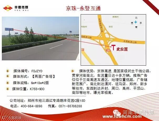 媒体优势:京珠高速,是国家级的主干线公路,贯穿河南南北,车流量日达十多万辆。推荐广告位位于兰南高速互通区,地理位置优越,广告辐射范围广,南北到达漯河、驻马店、郑州、新乡等地市,东西到达开封、周口、禹州、平顶山、南阳等地市,曝光率极高。
