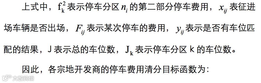各宗地开发商的停车费用来源可以分为两个部分,第一部分是根据车位匹配结果分配给各家开发商的停车费用,该部分停车费用可以根据二次0-1整数型规划的模型思想,建立如下所示的停车费用清分目标函数: