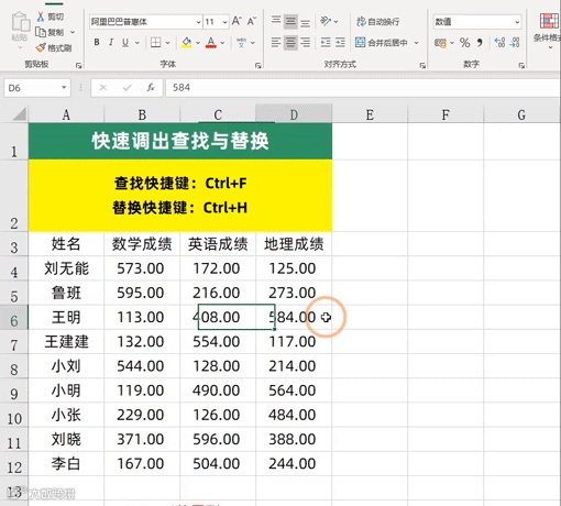 按下Ctrl+F,用于调出表格中查找指令,用来查找表格中的元素,同理,Ctrl+H用于替换表格中的元素