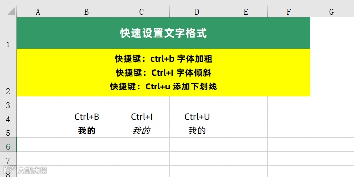 Ctrl+b:字体加粗, Ctrl+I:字体倾斜, Ctrl+u:添加下划线