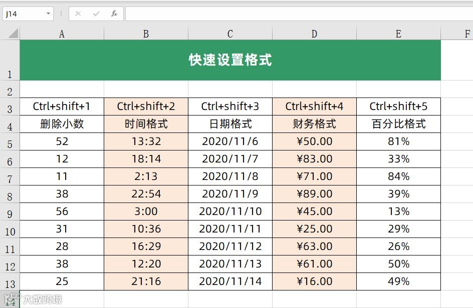 Ctrl+shift+1:删除小数,Ctrl+shift+2:设置时间格式,Ctrl+shift+3:设置日期格式,Ctrl+shift+4:财务格式Ctrl+shift+5百分比格式
