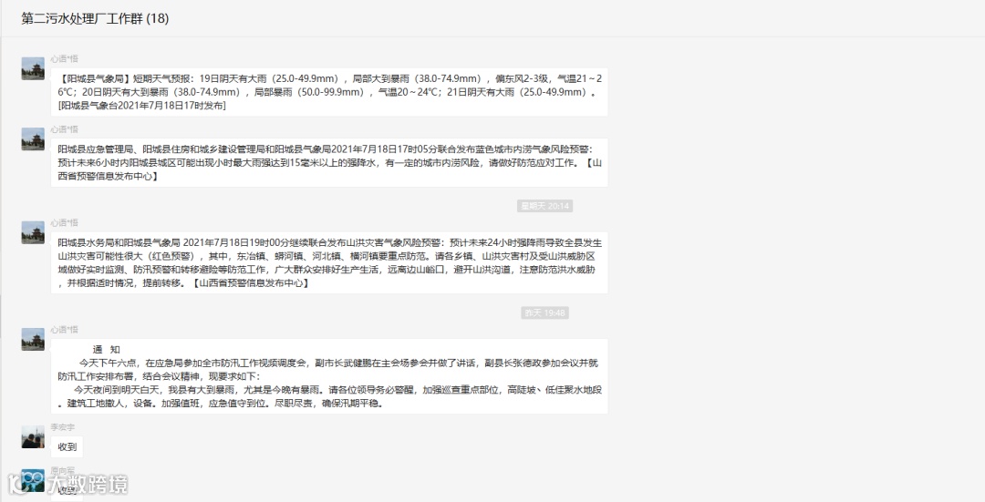 1.集团公司工作群、鼎青内部工作群、第二污水厂项目群中每天都会发送当前最新的气象预报,对天气情况时刻监督。