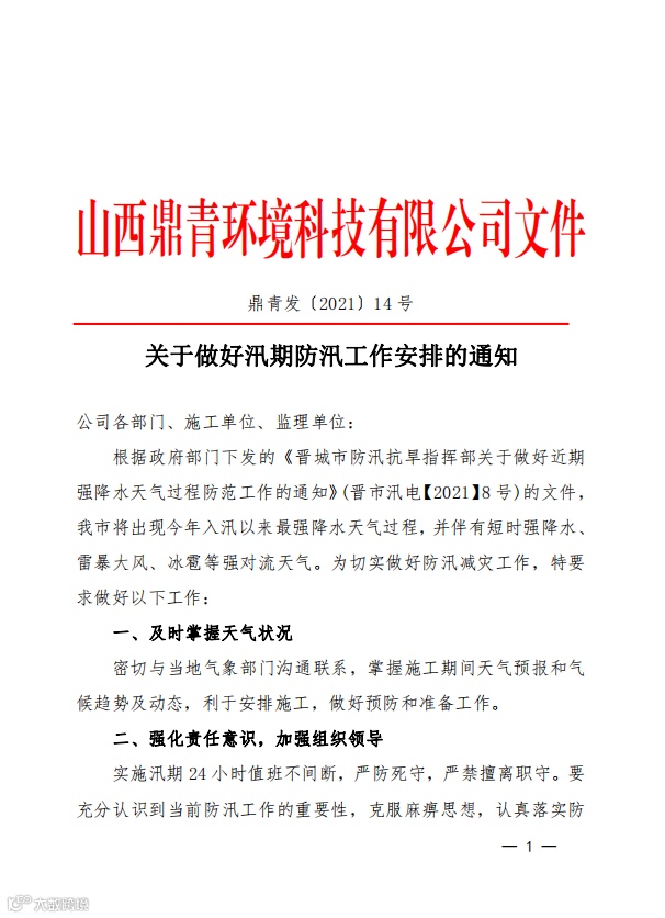 1. 7月11日,鼎青公司下发《关于做好汛期防汛工作安排的通知》(鼎青发【2021】14号)并部署相关防汛工作,要求及时掌握天气情况,做好施工现场的防汛检查工作,加强组织领导。