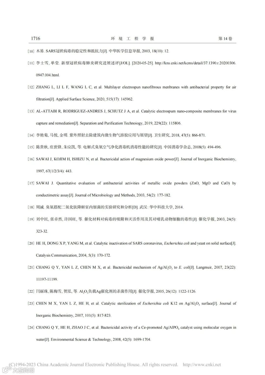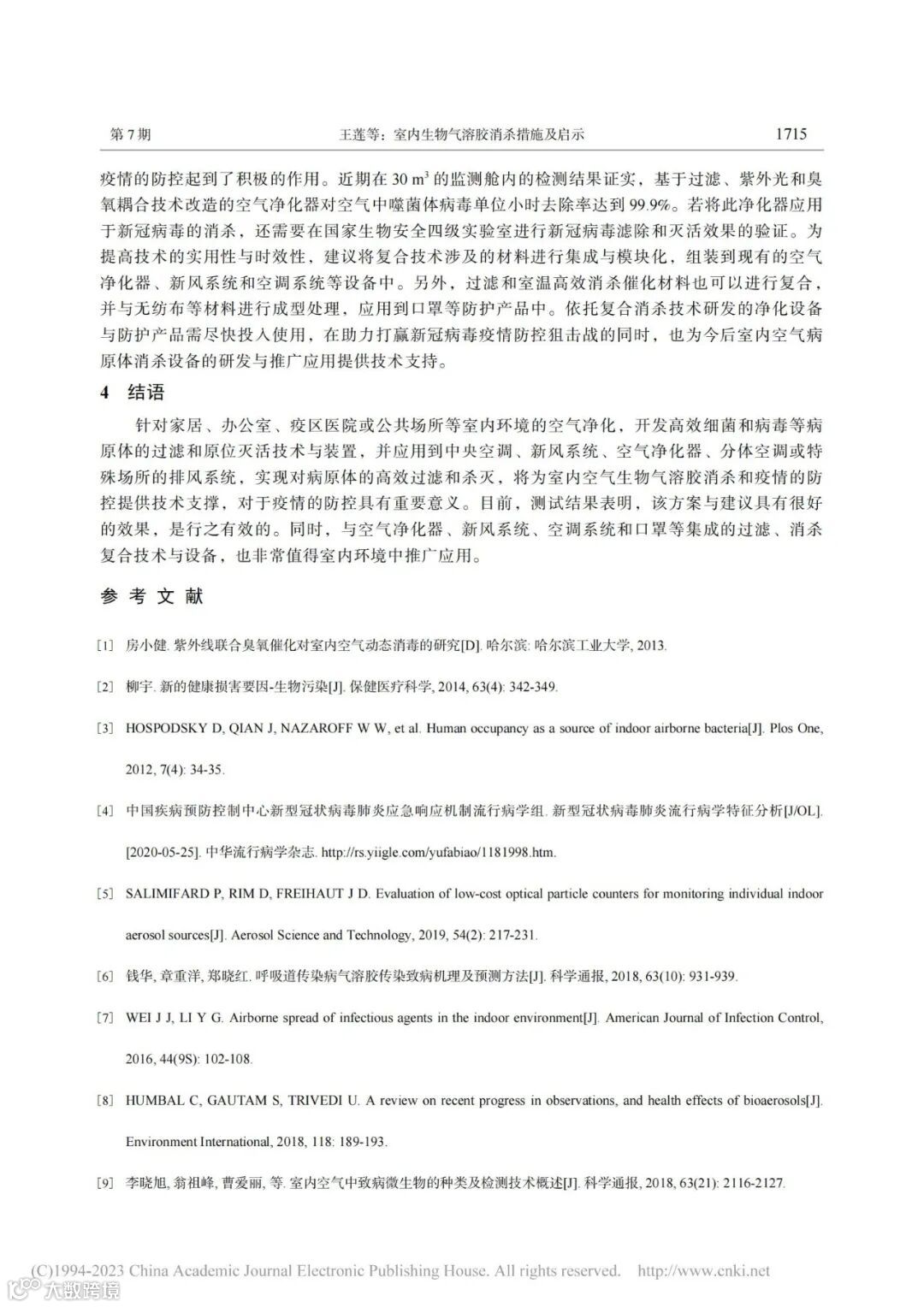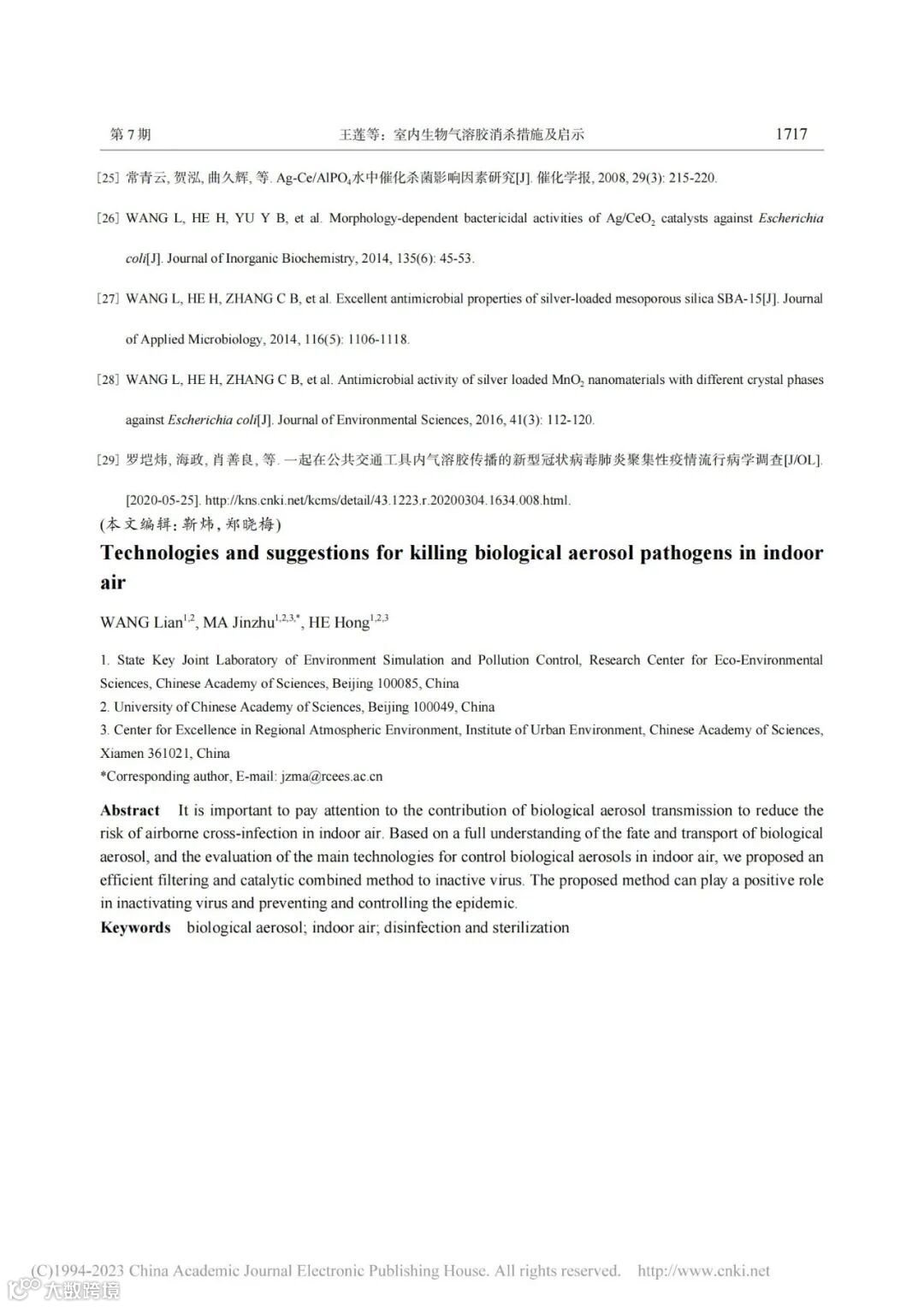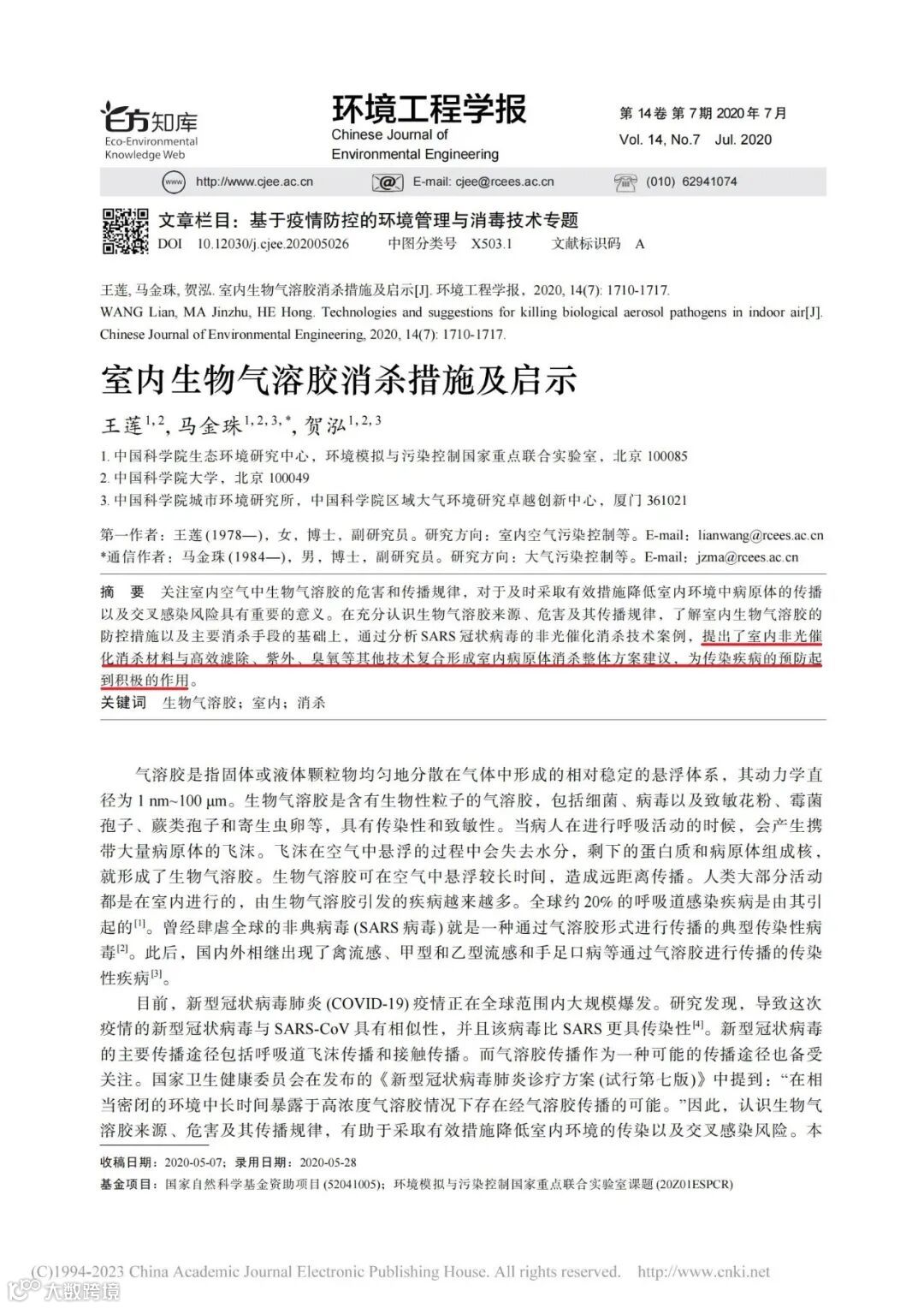 “室内生物气溶胶消杀措施及启示”这一文章已于2020 年 7 月在《环境工程学报》杂志正式发表。