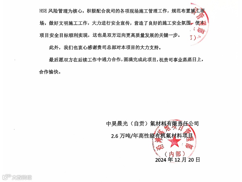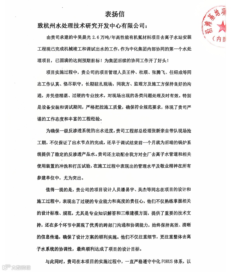 近日,在项目组的合力攻坚下,中昊晨光2.6万吨/年高性能有机氟材料项目去离子水站安装工程顺利完成机械竣工和调试出水,保质保量完成节点目标。业主特意发来表扬信,为杭州水处理项目团队点赞!