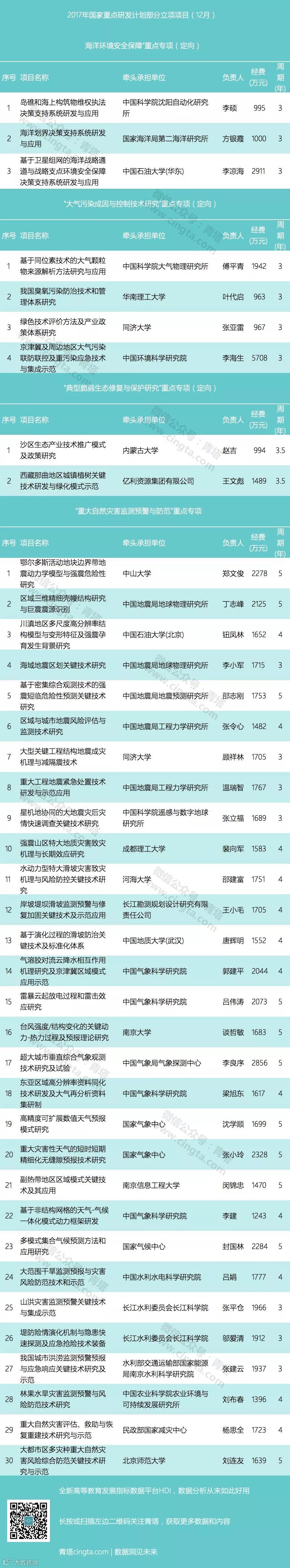 本次公示的项目集中在“重大自然灾害监测预警与防范”重点专项以及海洋环境安全保障”重点专项(定向)、“典型脆弱生态修复与保护研究”重点专项(定向)和“大气污染成因与控制技术研究”重点专项(定向),其中后三个均为国家重点专项的定向项目。本次共有39个项目入选,项目总金额达到7.14亿元。