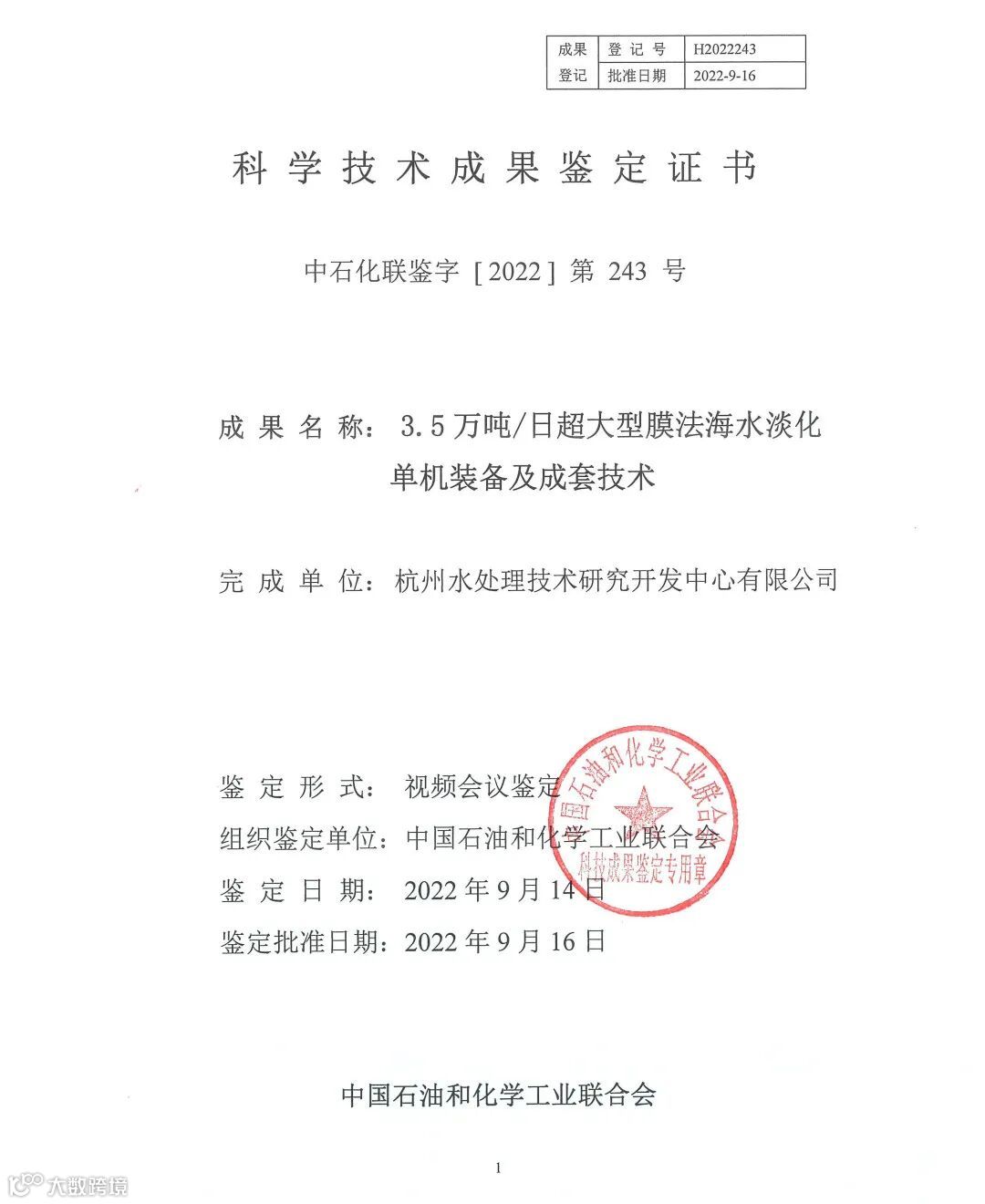 中国石油和化学工业联合会组织专家对杭州水处理完成的“3.5万吨/日超大型膜法海水淡化单机装备及成套技术”进行了科技成果鉴定,鉴定会以视频方式召开。