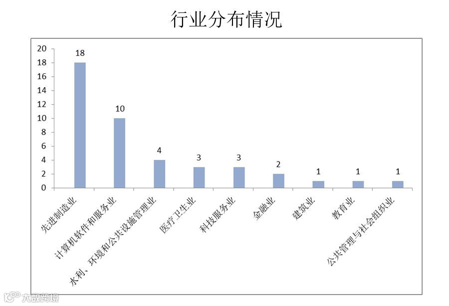 43家博士后创新实践基地主要分布于先进制造业(新能源、新材料)、计算机软件和服务业、水利、环境和公共设施管理业,分别有18家、10家、4家;医疗卫生业、科技服务业分别有3家;金融业有2家;建筑业、教育业和公共管理与社会组织业均只有1家。