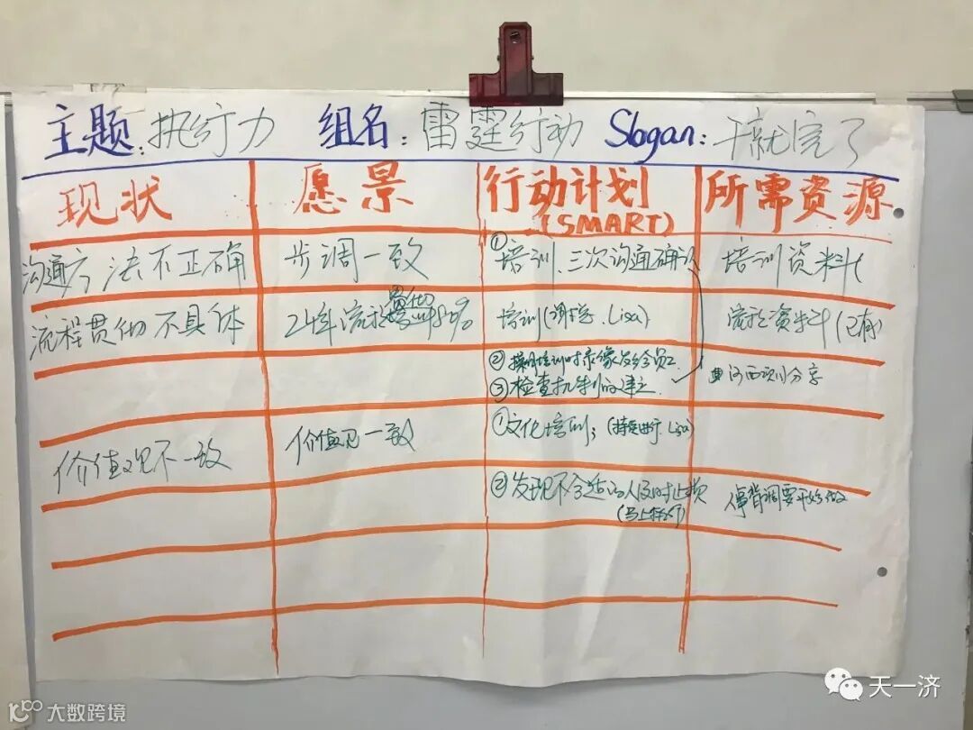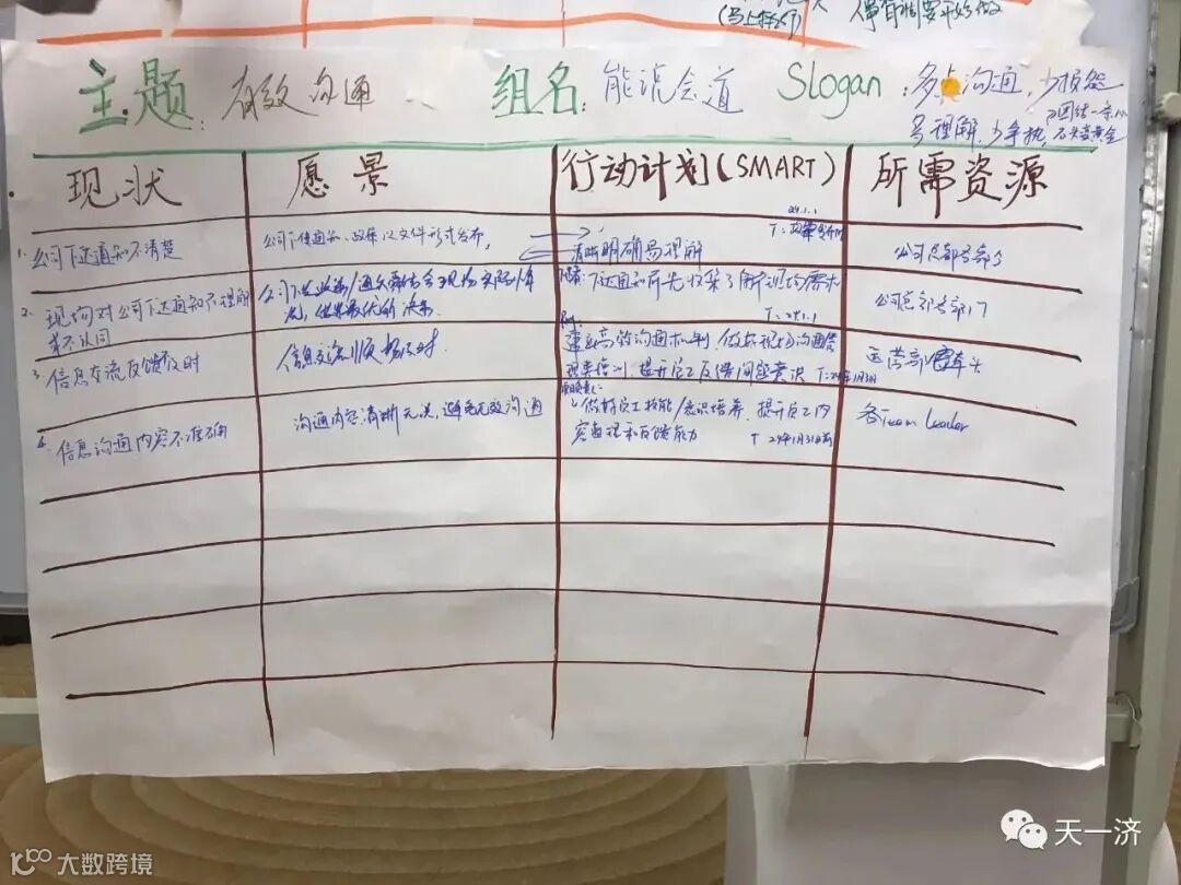 四、三组队员一共提出15个“高绩效组织特质”,经过大家头脑风暴后最终提炼出5个特质,然后再经过每人对每个特质进行四色标签投票,最终形成了3个最重要的需要解决的问题方向,即执行力、有效沟通、互相关爱。最终针对此三个方向由三组队员分别展开激烈的讨论,形成了《行动方案》。。。。。。