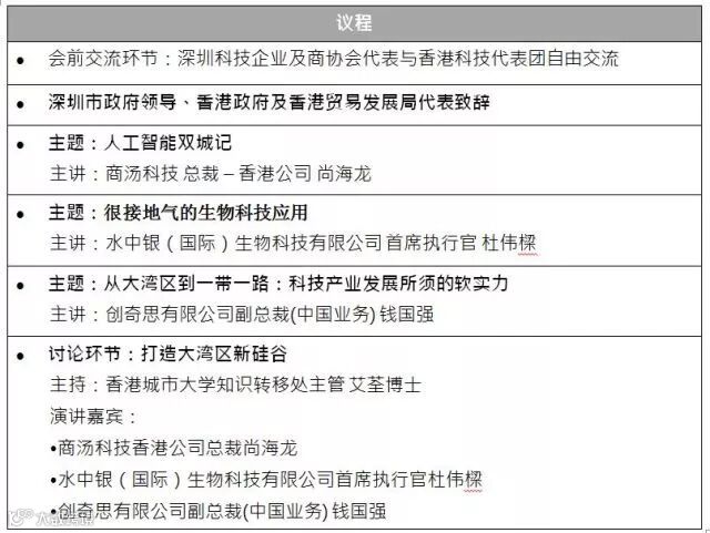 香港贸发局和香港政府创新科技署将于深圳高交会期间举办“香港日”活动,在高交会1号馆设立香港科技展区,组织香港科技代表团参加高交会,并于高交会首日(11月16日)举办“香港科技论坛”,探讨深港两地创新科技合作模式,共同打造粤港澳大湾区新硅谷。