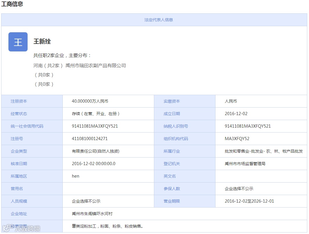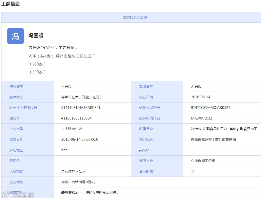 据企盾宝资料显示,禹州市夏都三粉厂成立于2016年6月14日,公司注册资本为50万元,公司法人代表是冯国明,公司主营业务为薯类淀粉加工、淀粉及淀粉制品销售。