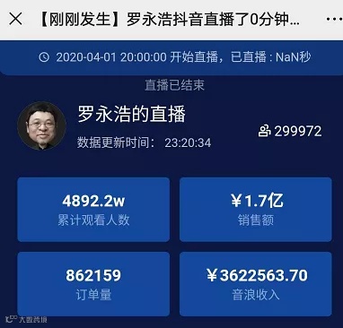 据企盾宝了解,此次直播留下的成绩单是交易额超1.1亿,累计观看人数超4800万,也有数据显示罗永浩的抖音直播累计观看人数4892.2万人,销售额1.7亿人民币,订单量86.2万,音浪收入362.3万(据悉,1元等于10音浪,即收入约36.2万元)。而且在直播开始前,罗永浩的抖音账号就已经收获了近500万粉丝,经过一晚直播,直接涨粉至746万,500万获赞, 稳居抖音单日涨粉排行榜第一名。光是开播之前的打赏,就达达到了52.8万音浪,不愧为“中国第一代网红”,罗老师的网络号召力丝毫不减当年。总之,这场直播卖货首秀的数据相当亮眼,抖音的6000万花得值了。