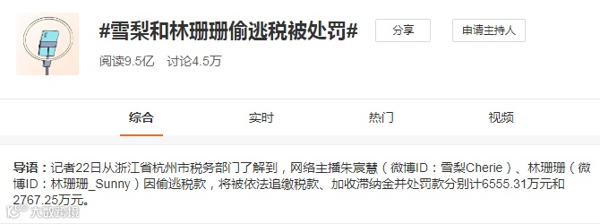当日,微博话题#雪梨和林珊珊偷逃税被处罚#迅速霸占了热搜榜第一,阅读量达到了9.5亿,讨论量达到了4.5万。与此同时,关于网红带货主播应该如何缴税,网红主播到底有多赚钱等话题被大量讨论。