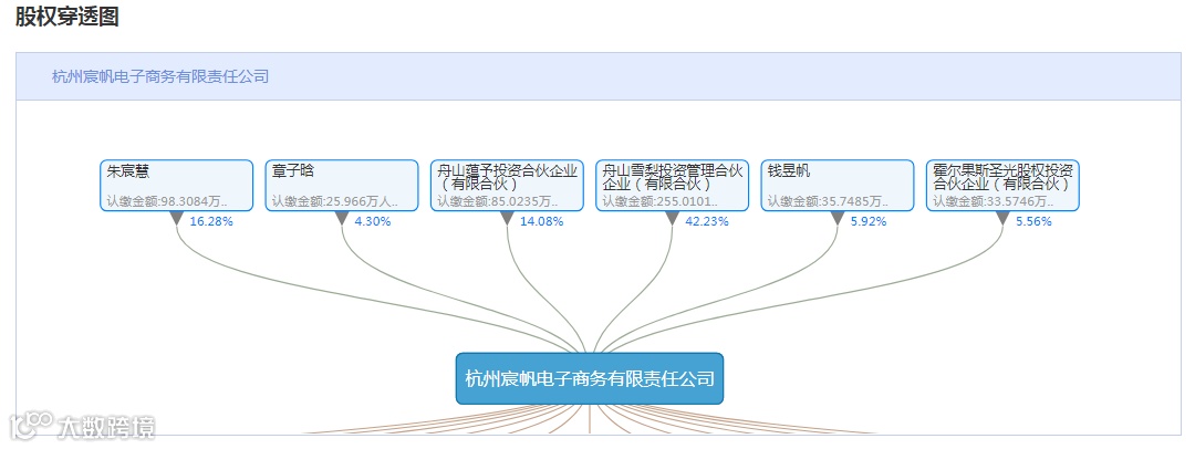 从企盾宝股权穿透功能模块可以看到,杭州宸帆电子商务有限责任公司的第一大股东是舟山雪梨投资管理合伙企业(有限合伙),占股42.23%;第二大股东为雪梨本人,占股16.28%;第三大股东为,舟山蕴予投资合伙企业(有限合伙),占比14.08%。而舟山蕴予投资合伙企业(有限合伙)也是由雪梨、林珊珊共同持股的,两人分别占股71.6%和28.4%。