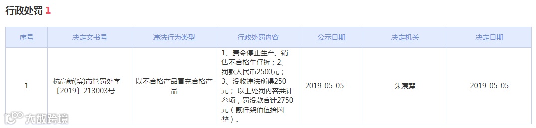 此外,杭州宸帆电子商务有限责任公司在2019年5月5日,因“以不合格产品冒充合格产品”,被杭州滨江市场管理局处罚。