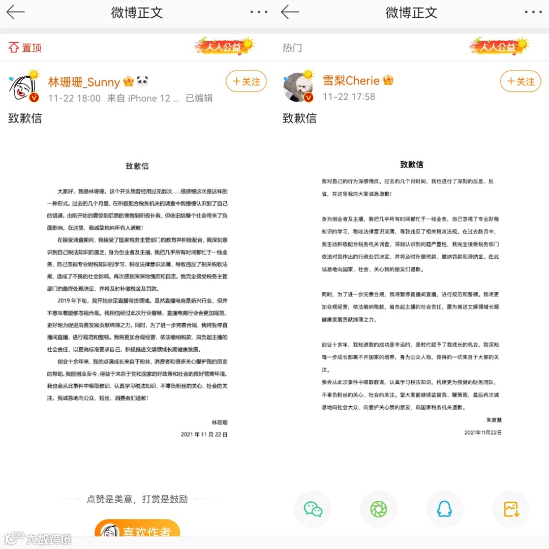 目前,雪梨、林珊珊二人均已在微博上公开道歉。表示完全接受税务部门对自己做出的行政处罚决定,并将及时补缴税金及罚款。