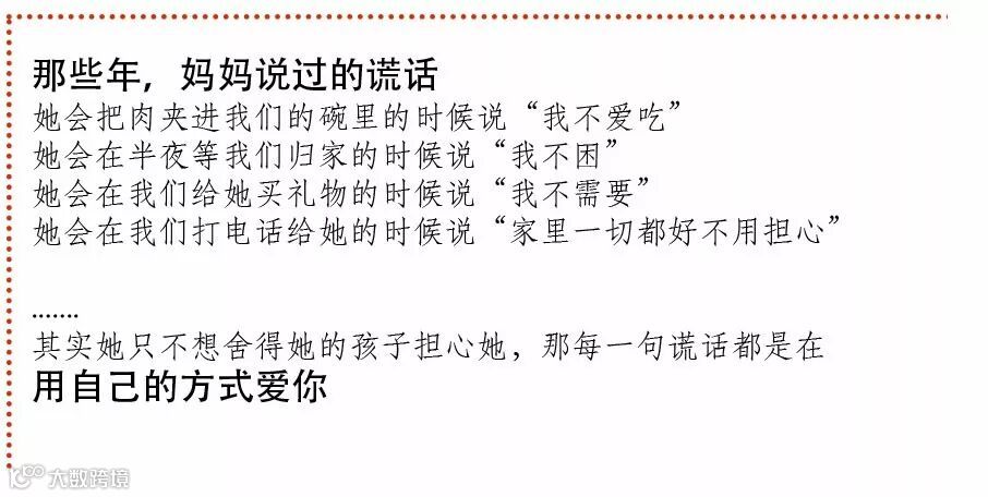 “妈妈们都有个通病,只要你说了哪样菜好吃,她们就频繁地煮那样菜,知道你厌烦地埋怨为止。其实她这辈子就是在拼命把你觉得好的给你,都给你,爱得不知所措了而已。” ——张爱玲
