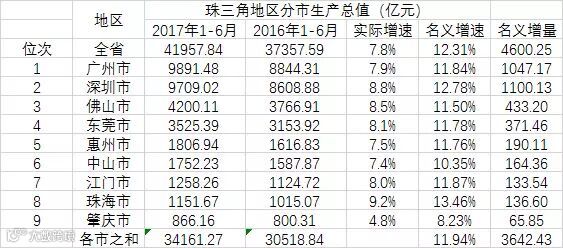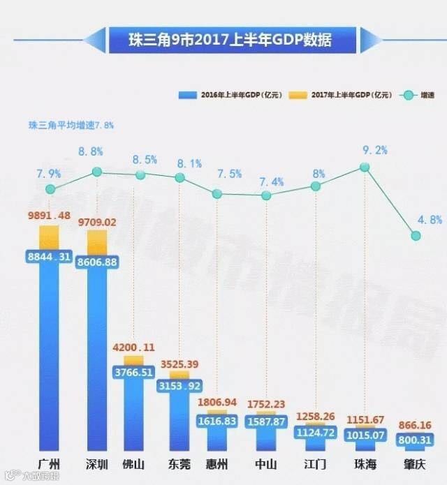 粤港珠三角9市2017上半年GDP对比