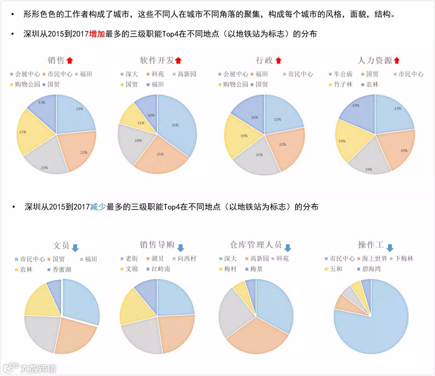 城市是多样的,这个多样归根到底是人的多样。从劳动者的结构上看,深圳在过去的三年中,销售、软件开发、行政和人力资源类的就职人口增加迅速,国贸、会展中心、高新园等地铁站点的职能变化速度较快。相对应的,文员、销售导购、仓库管理人员、操作工等相对低端的职能,则正在从深圳消失。