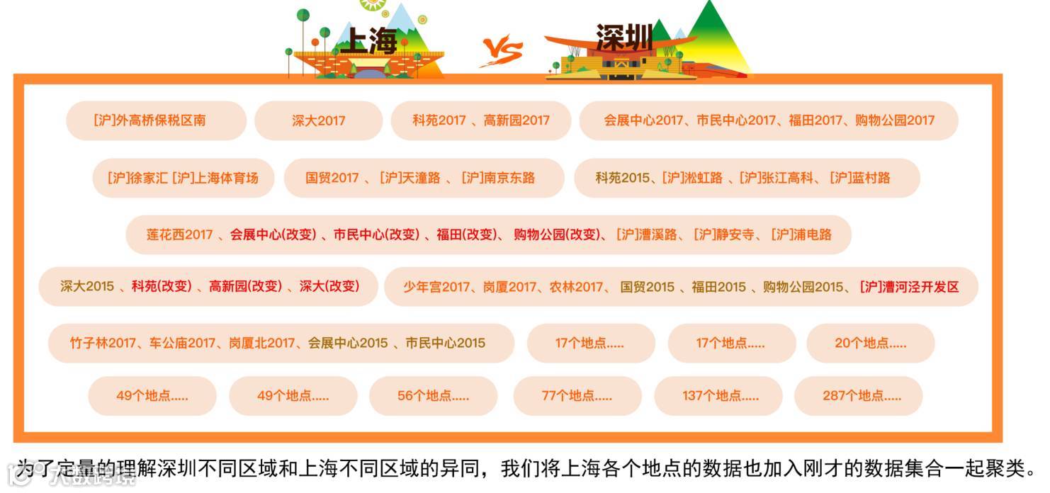 但是即便如此,这些数据对于不了解深圳的外地人来说,依然十分抽象。想要快速了解深圳的话,最简单的方式就是拿一个自己熟悉的城市去比较。于是,陈鸿在向量空间中加入了上海的数据,又做了一次聚类。这样就可以通过一个转移效应,快速了解深圳的情况。