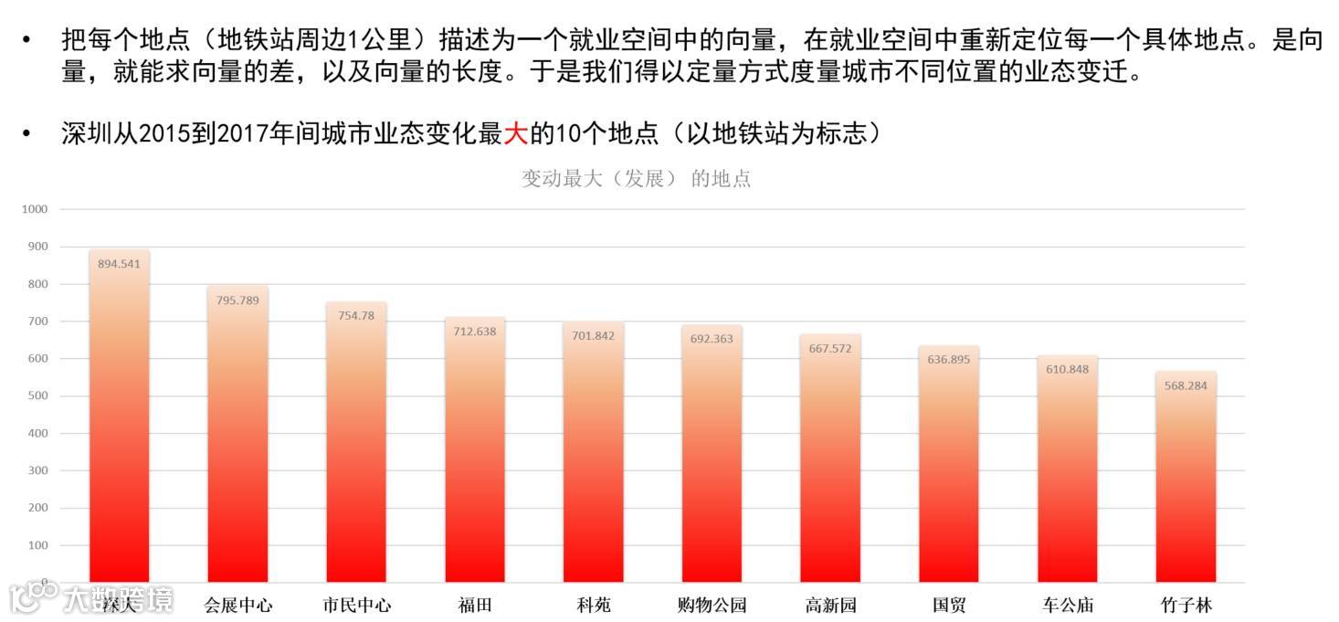 深大、会展中心、市民中心、福田、科苑、购物公园、高新园、国贸、车公庙、竹子林是用这种算法计算出的深圳在2015-2017年地区业态变化最大的十个地点。从数据上来讲,这些地方应该是发展比较快、有更多的就业人口涌入的区域,或者说是业态发生了巨大的转型,才会导致这些向量的改变值比较大。
