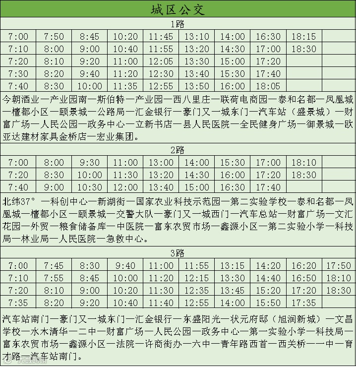 城区公交1.2.3路运营时间表,望周知!请持续关注微信公众号【山商交运】&【商河县汽车站】,以最新通知为准。如有疑问,欢迎拨打400-686-0035咨询。
