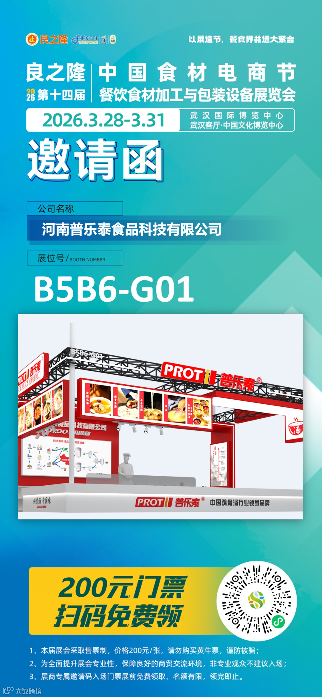 2026年3月28日—3月31日,河南普乐泰全系列产品及最新应用解决方案,盛装亮相良之隆·2026第十四届中国食材电商节展览会。在此,我们诚挚地向全国客户、行业专家及合作伙伴发出邀请,期待在武汉与您相聚,共话餐饮界的新未来。