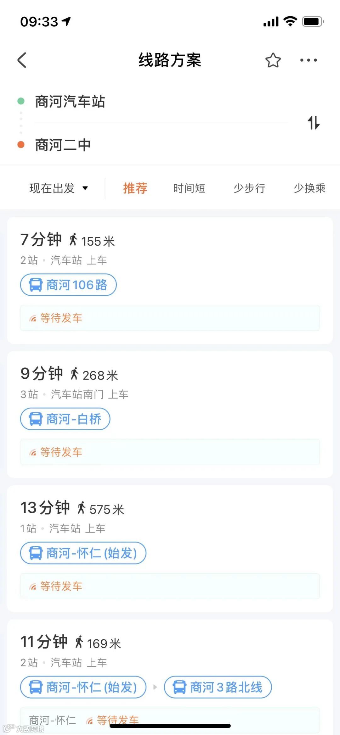 首页→“去哪”→输入起点和终点站,智能规划距离短、少步行、少换乘等多种乘车方案供您选择。