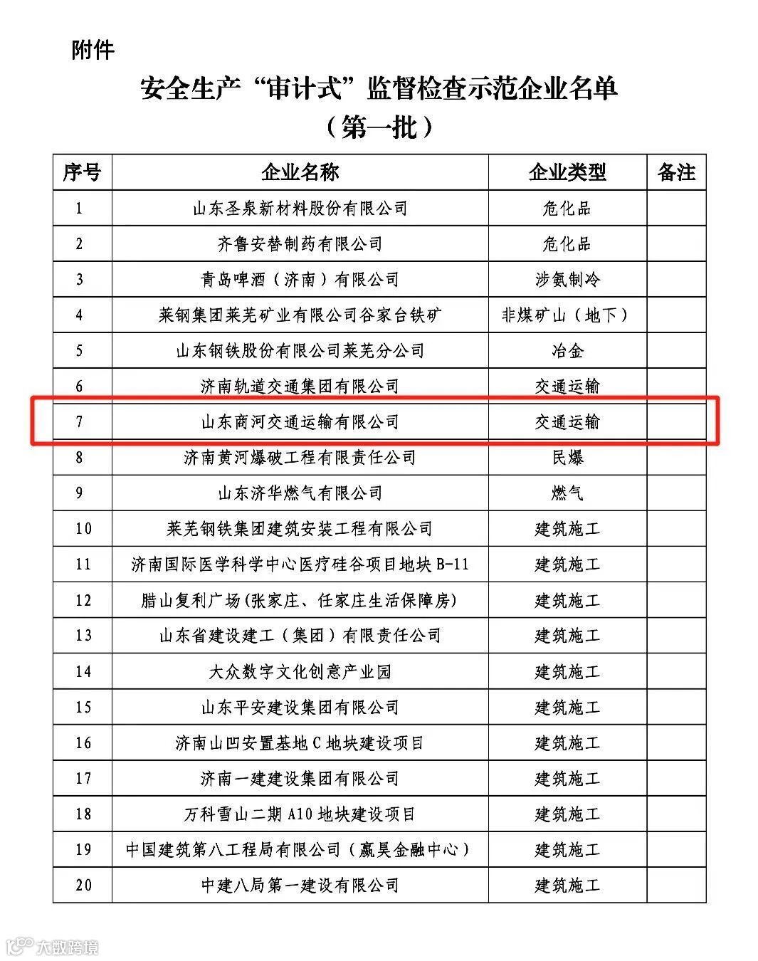 10月31日,济南市安全生产委员会办公室发布了《关于公布安全生产“审计式”监督检查示范企业名单(第一批)的通知》,山商交运荣获全市安全生产“审计式”监督检查示范企业称号,第一批示范企业全市共20家,山商交运成为商河唯一一家。