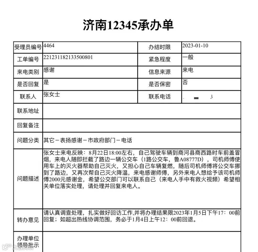 张女士通过市民服务热线反映,8月22日18:00左右,自己驾驶车辆到商河县商西路时车前盖冒烟,随即拦截了路边一辆公交车,山商交运驾驶员张恒明在危急时刻,他毫不犹豫拿起灭火器向起火车辆冲去,成功扑灭火情。又担心张女士车辆复燃,随后司机师傅将公交车挪到了路边,又再次帮张女士灭火降温,他灭火的一幕正好被张女士用视频记录下来。