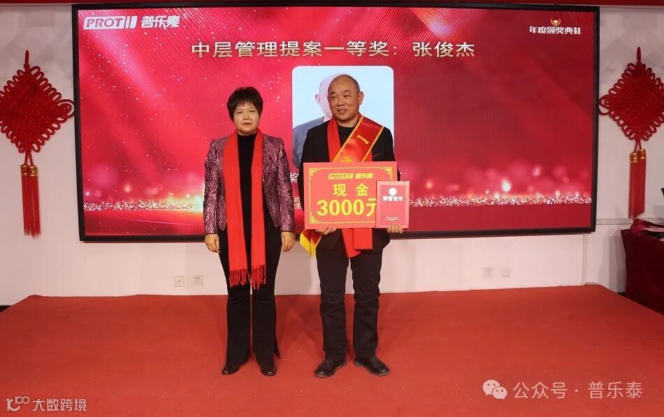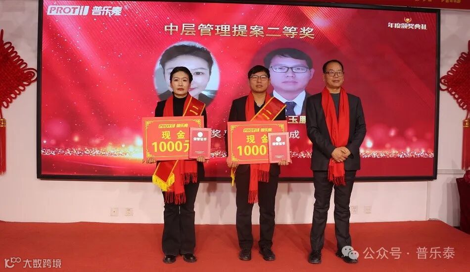 公司董事长助理牛保林宣读2024年度表彰决定:员工提案奖、中层提案奖、销售标兵奖、先进团队奖、员工参与提案奖。