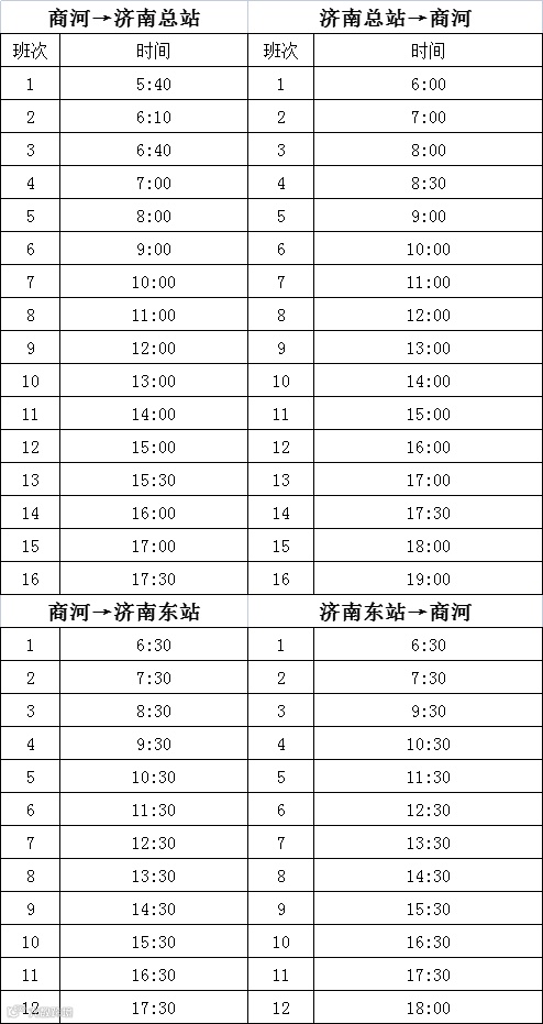 以上发车时间均为临时发车时间,我站将根据疫情防控形势及人流量随时调整其他线路班次及发车时间,请持续关注微信公众号【山商交运】&【商河县汽车站】&【商河长途汽车总站】,以最新通知为准。如有疑问,欢迎拨打400-686-0035咨询。