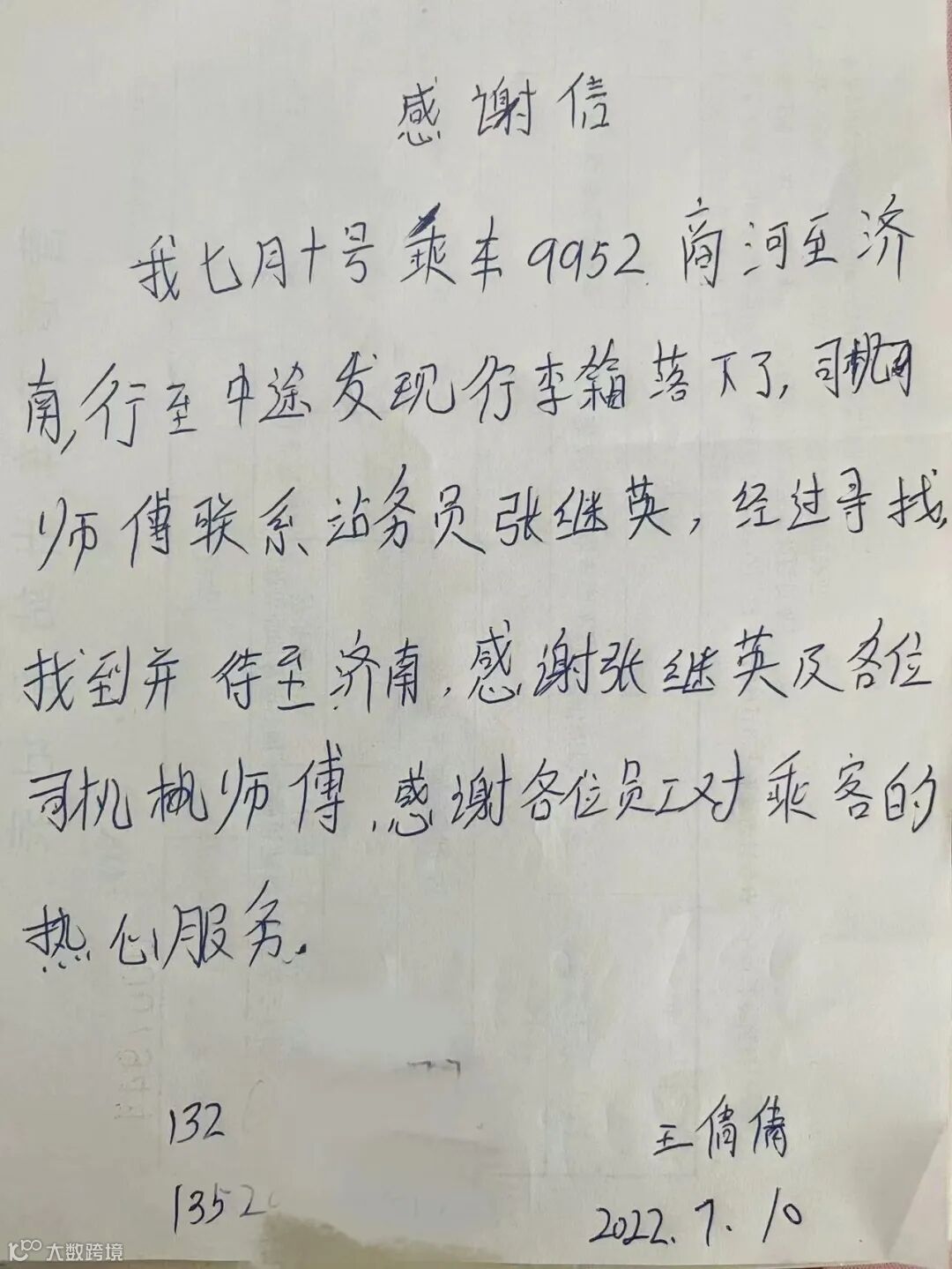 王女士特地写了感谢信,感谢张继英女士及庞小强师傅,感谢各位员工对乘客的热心服务。
