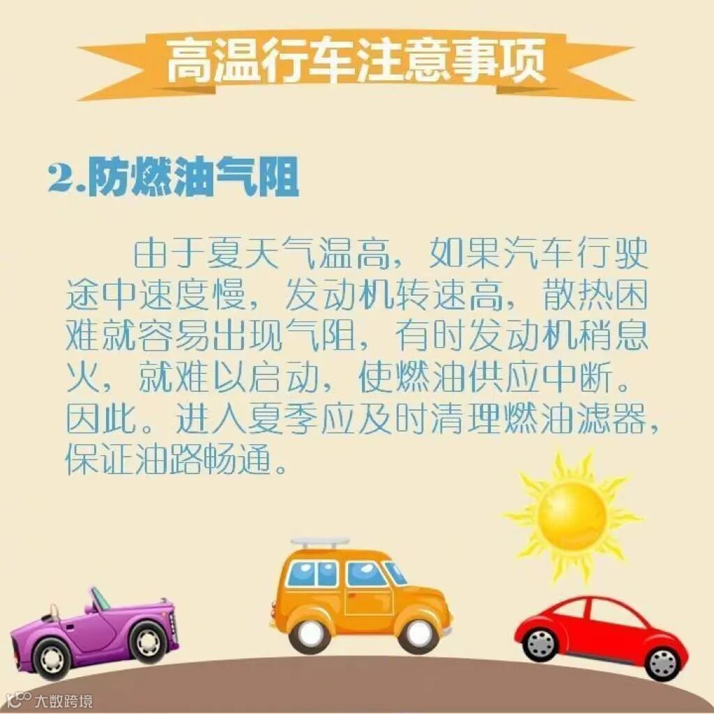 由于夏天气温高,如果汽车行驶途中速度慢,发动机转速高,散热困难就容易出现气阻,有时发动机稍息火,就难以启动,使燃油供应中断。因此。进入夏季应及时清理燃油滤器,保证油路畅通。