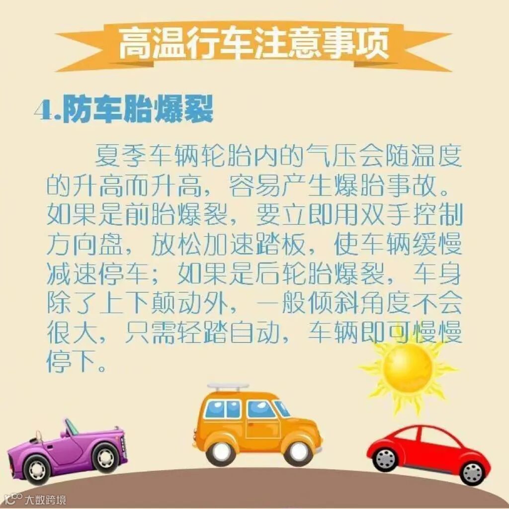 夏季车辆轮胎内的气压会随温度的升高而升高,容易产生爆胎事故。如果是前胎爆裂,要立即用双手控制方向盘,放松加速踏板,使车辆缓慢减速停车;如果是后轮胎爆裂,车身除了上下颠动外,一般倾斜角度不会很大,只需轻踏自动,车辆即可慢慢停下。