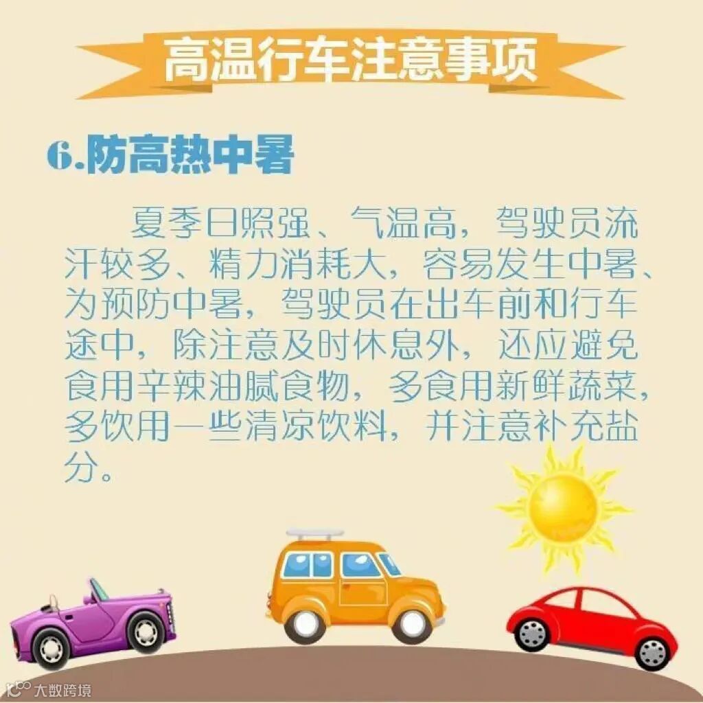 夏季日照强、气温高,驾驶员流汗较多、精力消耗大,容易发生中暑、为预防中暑,驾驶员在出车前和行车途中,除注意及时休息外,还应避免食用辛辣油腻食物,多食用新鲜蔬菜,多饮用一些清凉饮料,并注意补充盐分。