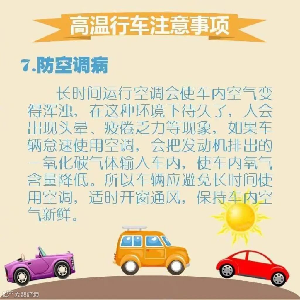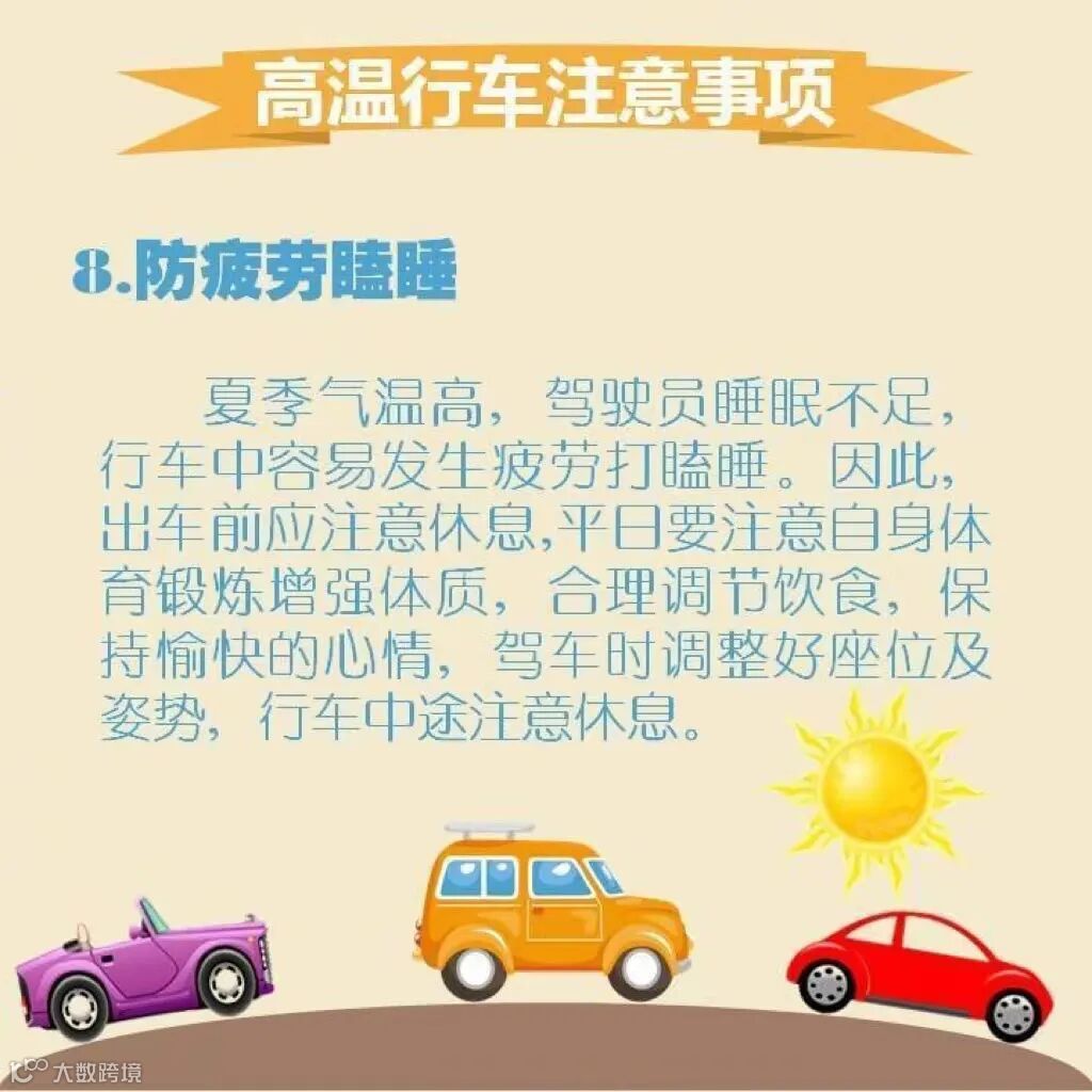 夏季气温高,驾驶员睡眠不足,行车中容易发生疲劳打瞌睡。因此,出车前应注意休息,平日要注意自身体育锻炼增强体质,合理调节饮食,保持愉快的心情,驾车时调整好座位及姿势,行车中途注意休息。