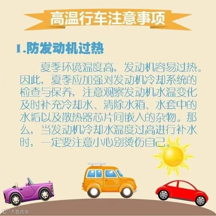 夏季环境温度高,发动机容易过热。因此,夏季应加强对发动机冷却系统的检查与保养,注意观察发动机水温变化及时补充冷却水、清除水箱、水套中的水垢以及散热器芯片间嵌入的杂物。那么,当发动机冷却水温度过高进行补水时,一定要注意小心别烫伤自己。