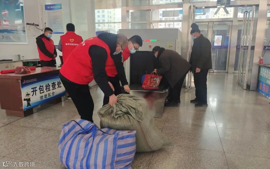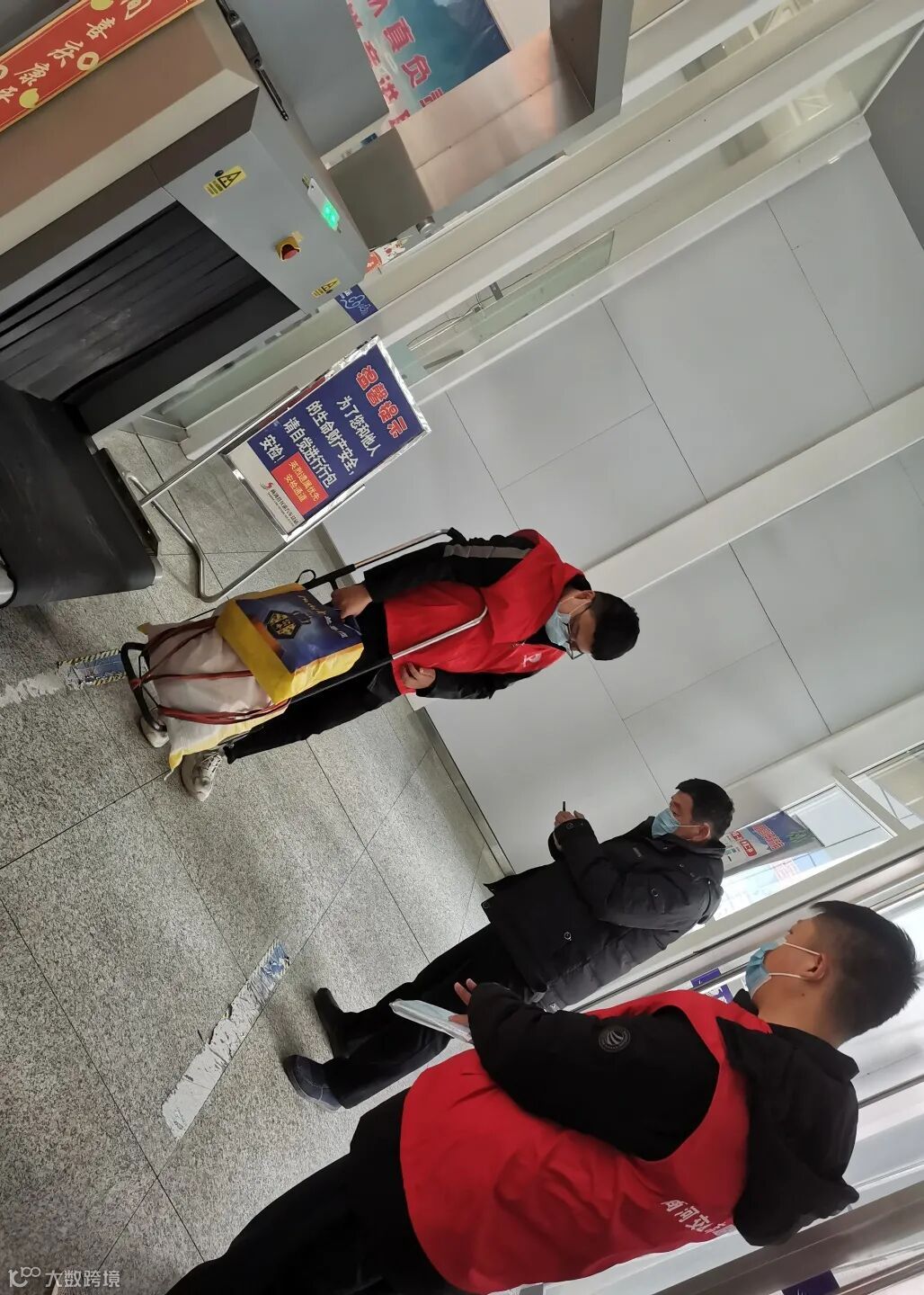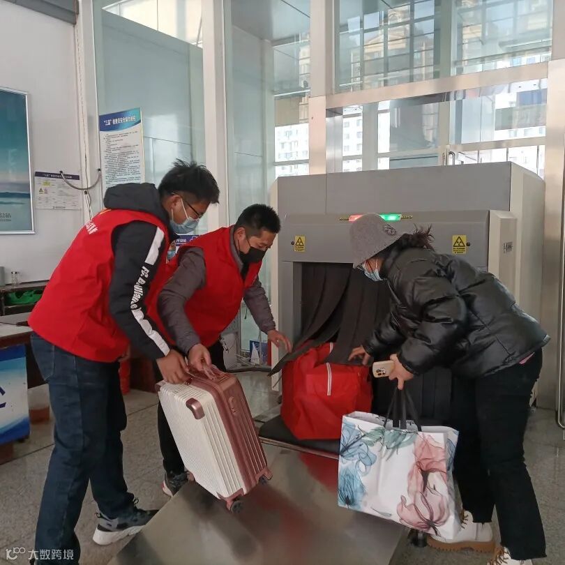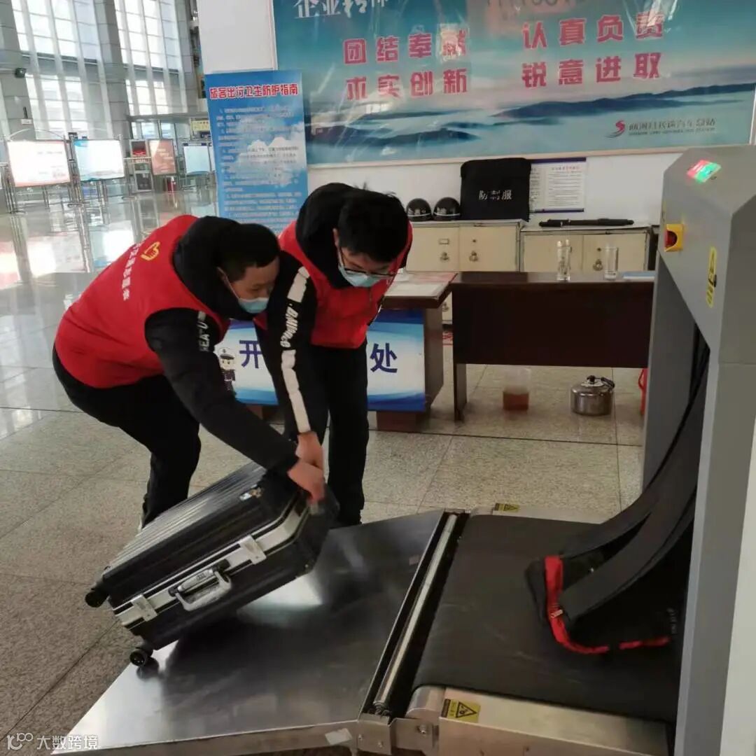 在安检处,志愿者们协助安检人员查验包裹,检查有无易燃易爆等危险品,并帮助行李重多的乘客提拉行李,换来乘客感谢声一片。