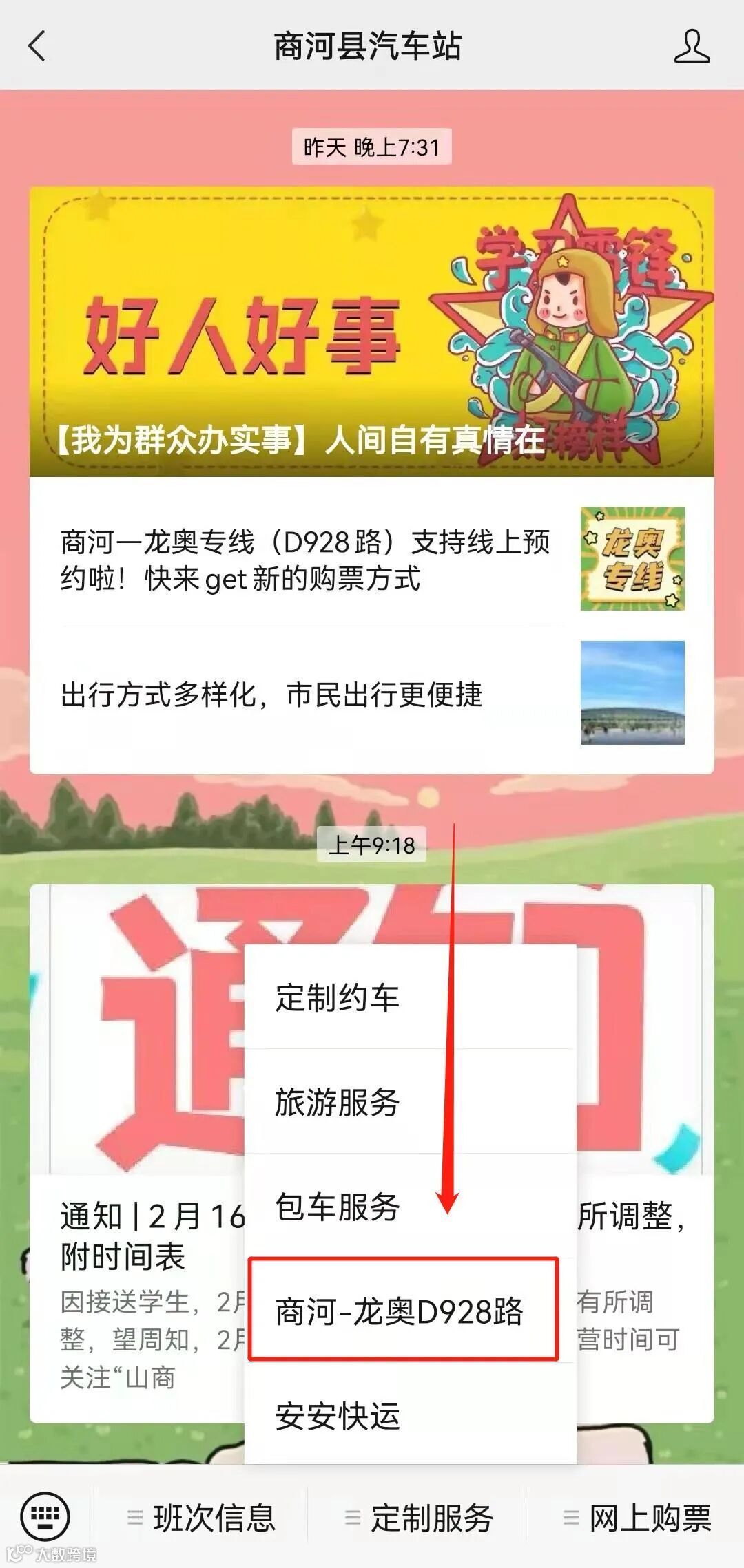 1.关注微信公众号【商河县汽车站】&【山商交运】&【商河长途汽车总站】,点击底部菜单栏【定制服务】,选择【商河-龙奥D928路】,进入悦程小程序;